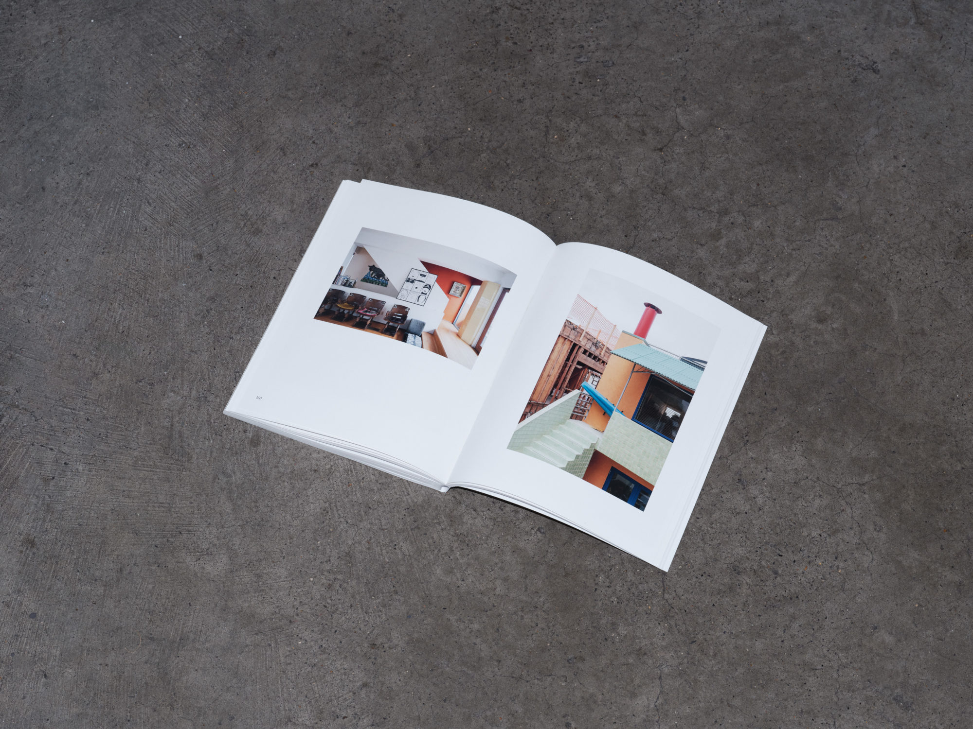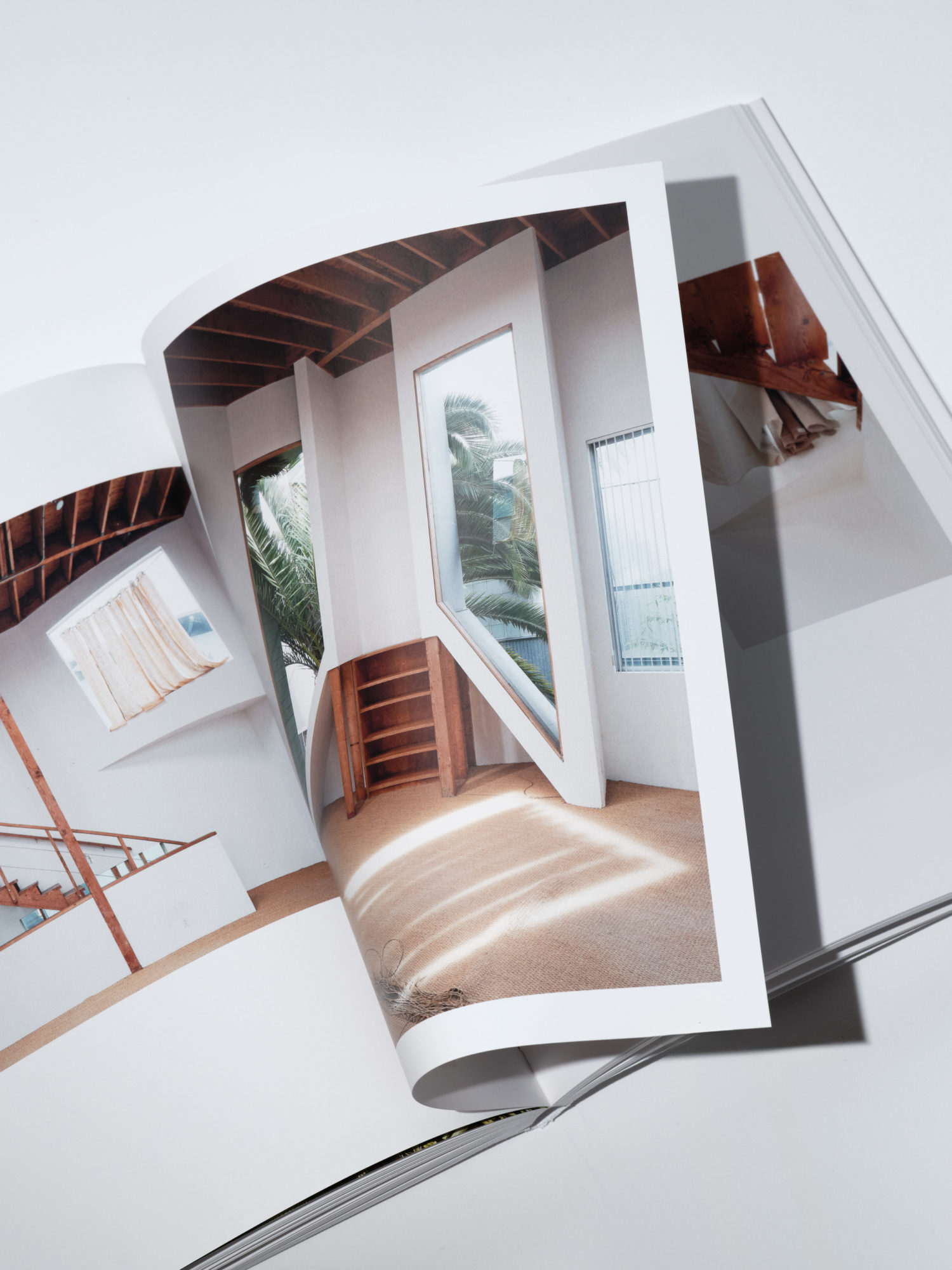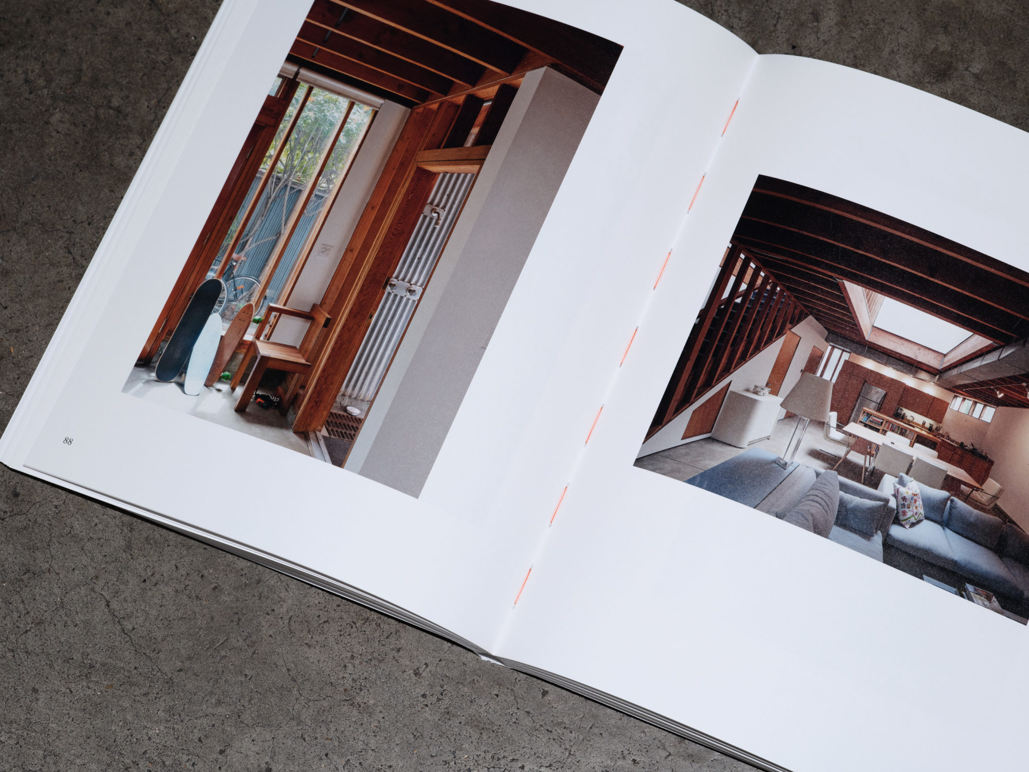 In keeping with this spirit, we designed a matter-of-fact white paperback, bound with orange-brown stitching. A rigorous yet playful layout balances exuberance with control, echoing the tumble of plywood, timber frames, light and shadow in Dehlin’s images.