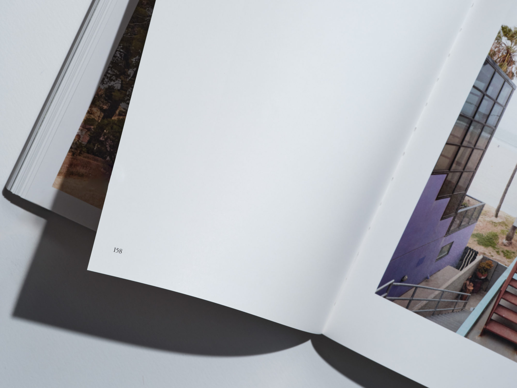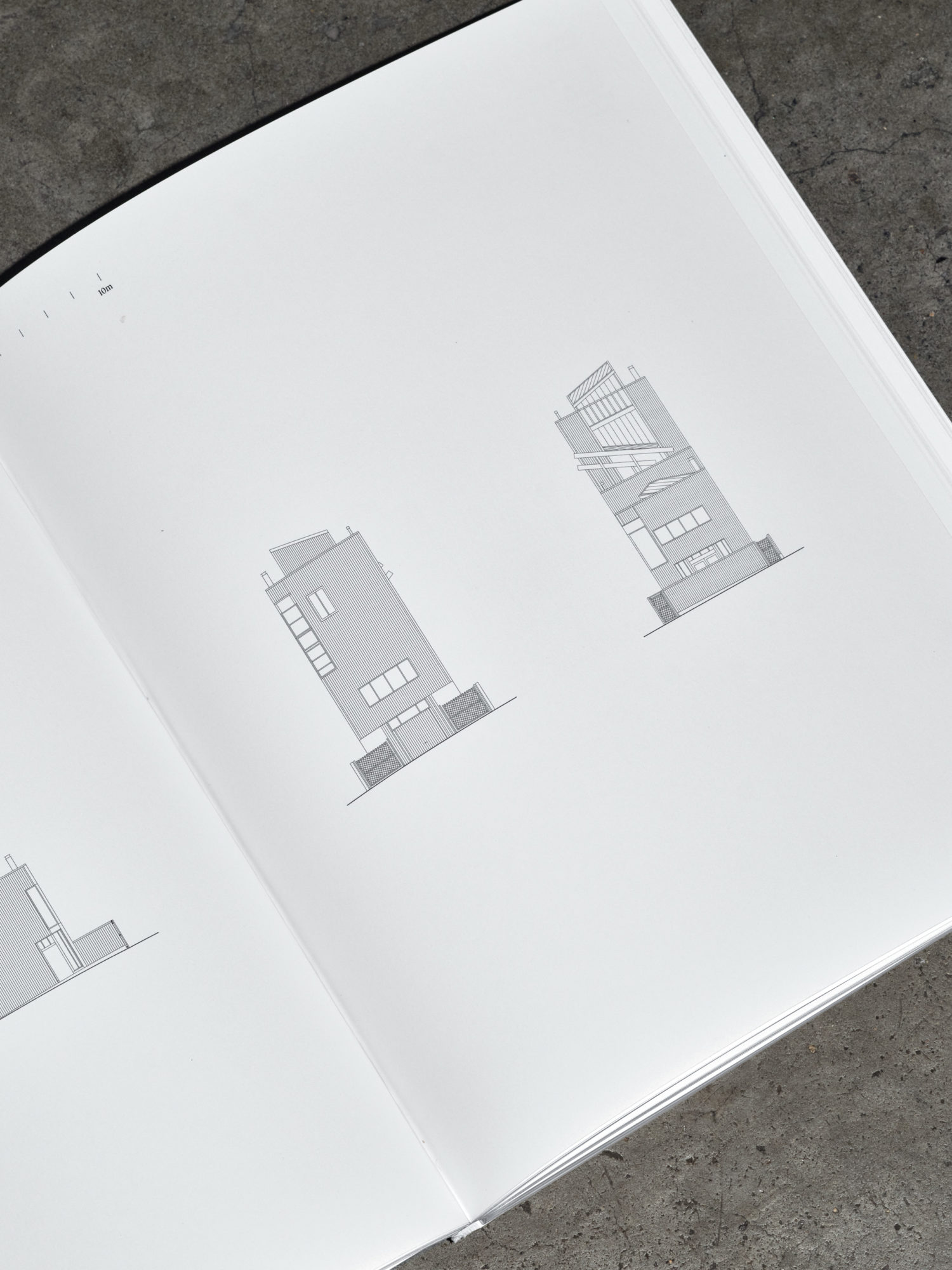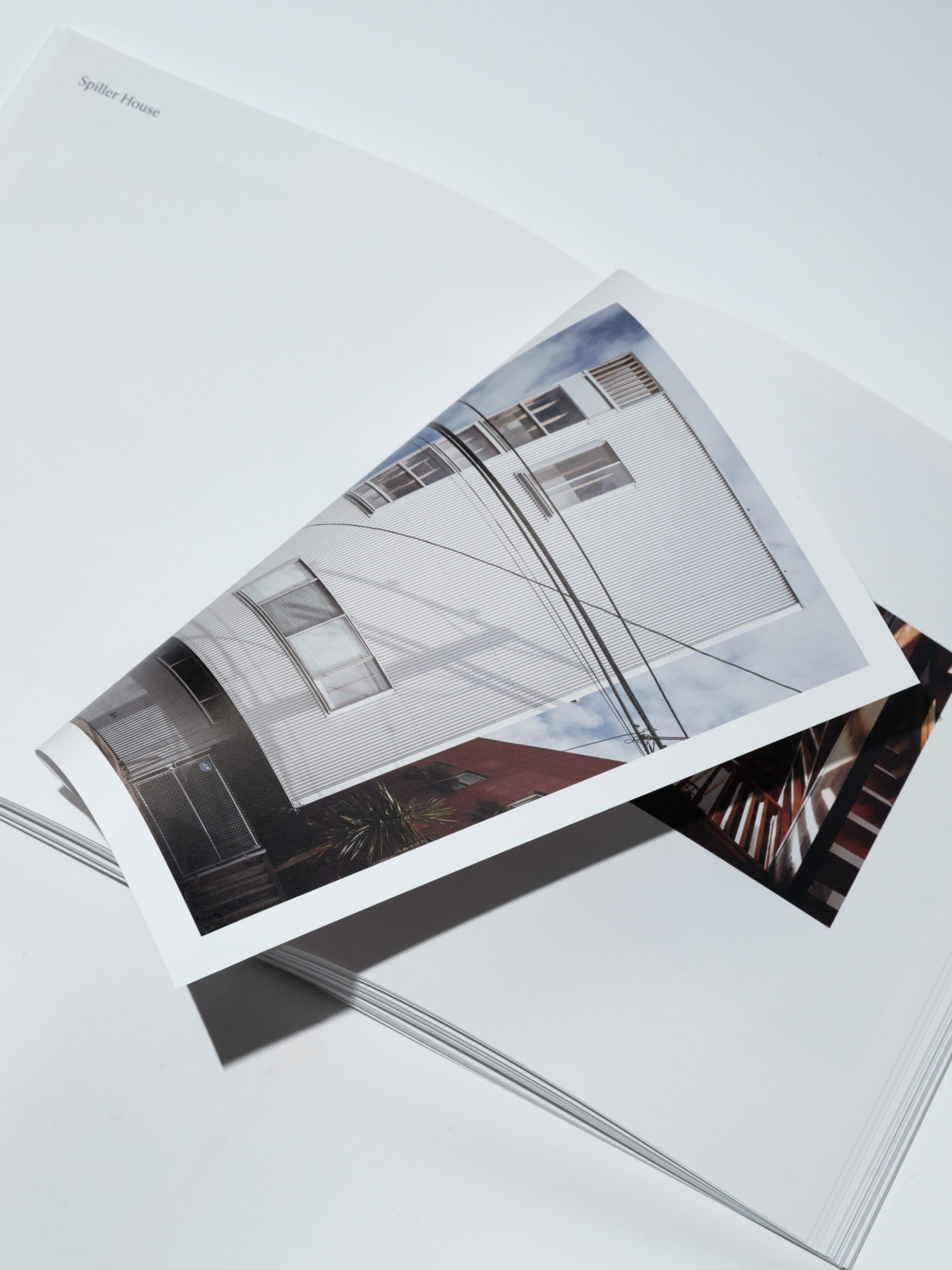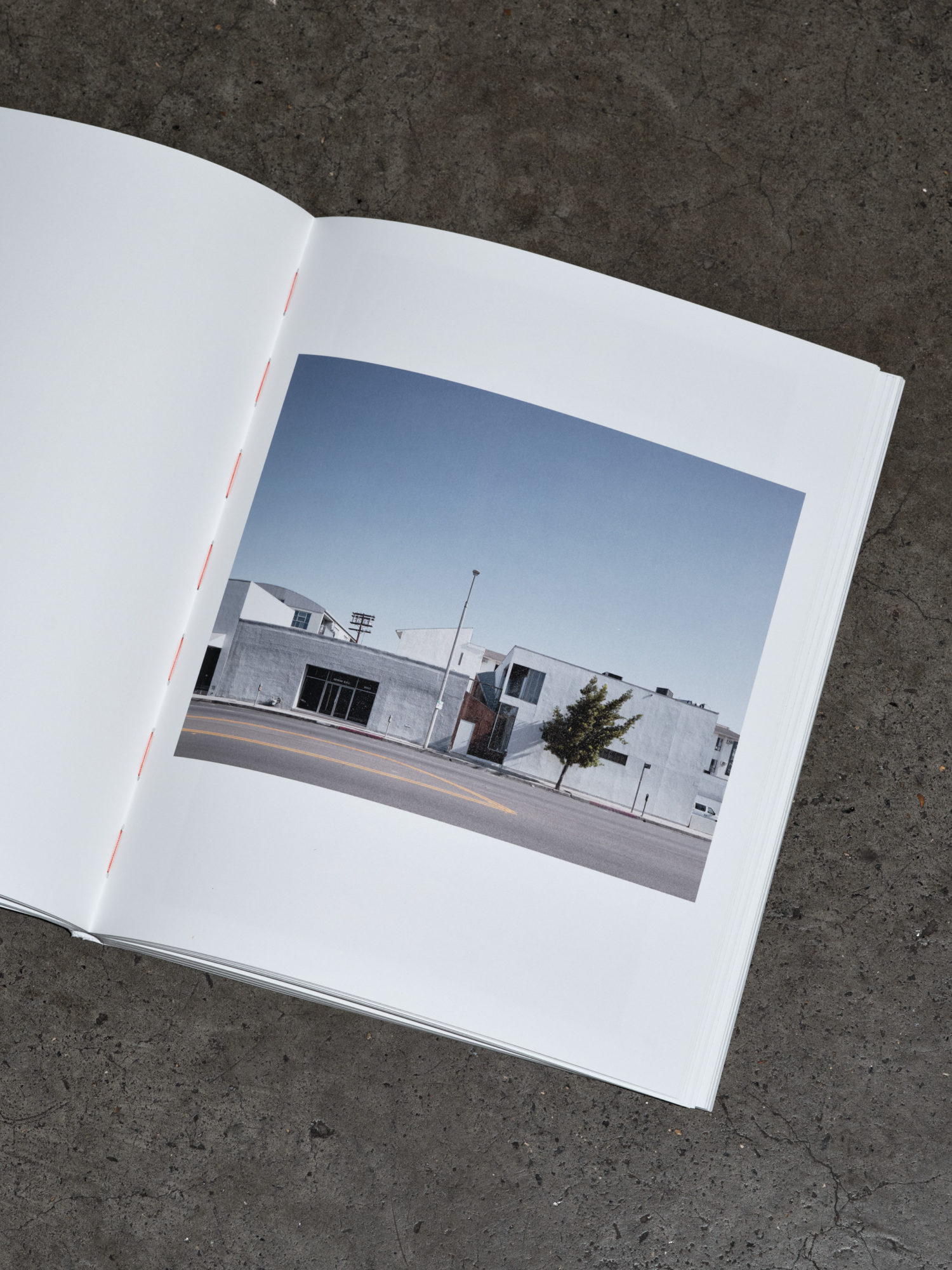 In keeping with this spirit, we designed a matter-of-fact white paperback, bound with orange-brown stitching. A rigorous yet playful layout balances exuberance with control, echoing the tumble of plywood, timber frames, light and shadow in Dehlin’s images.