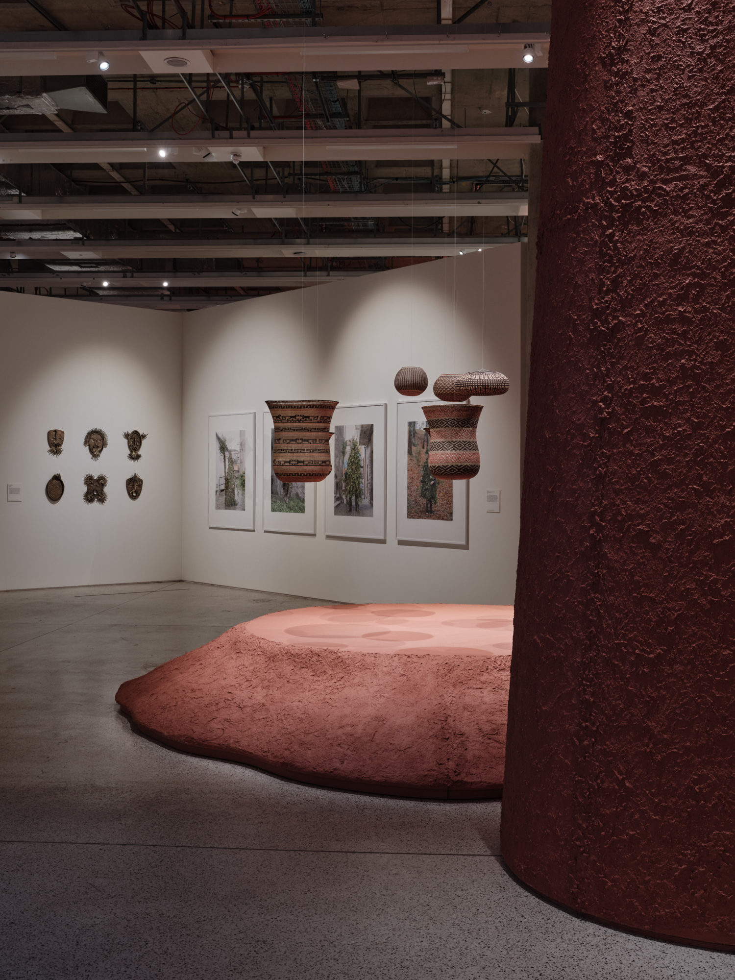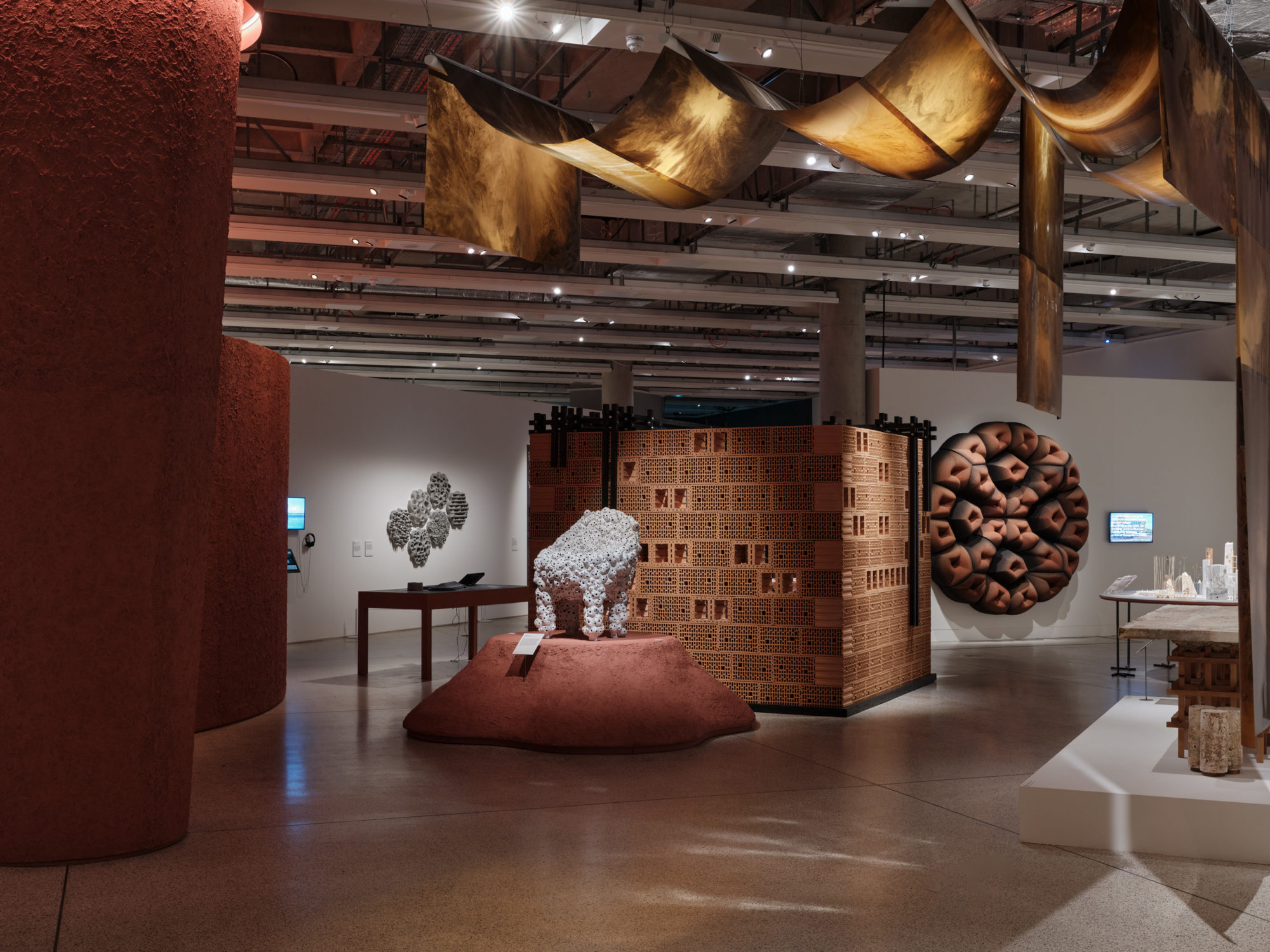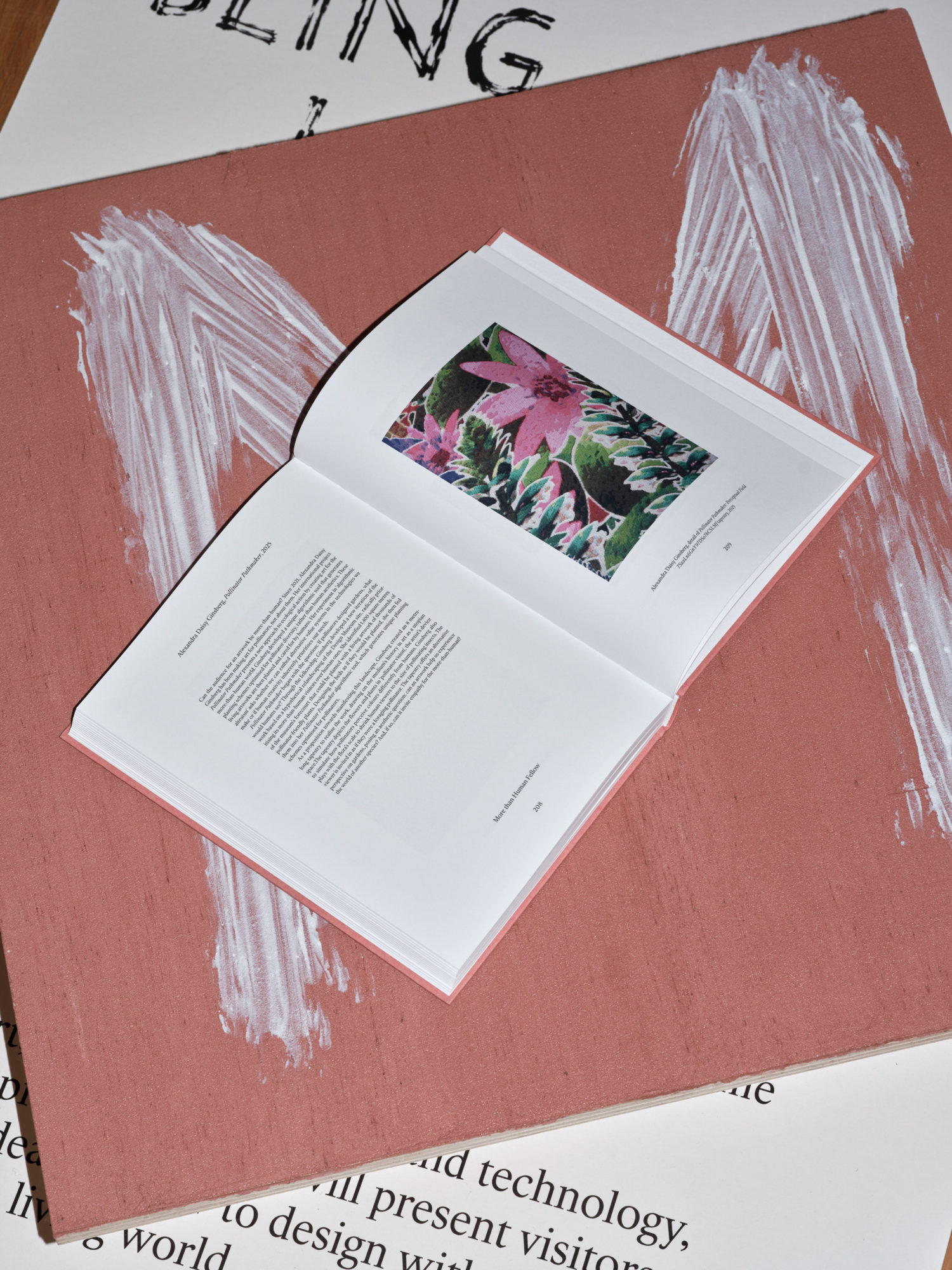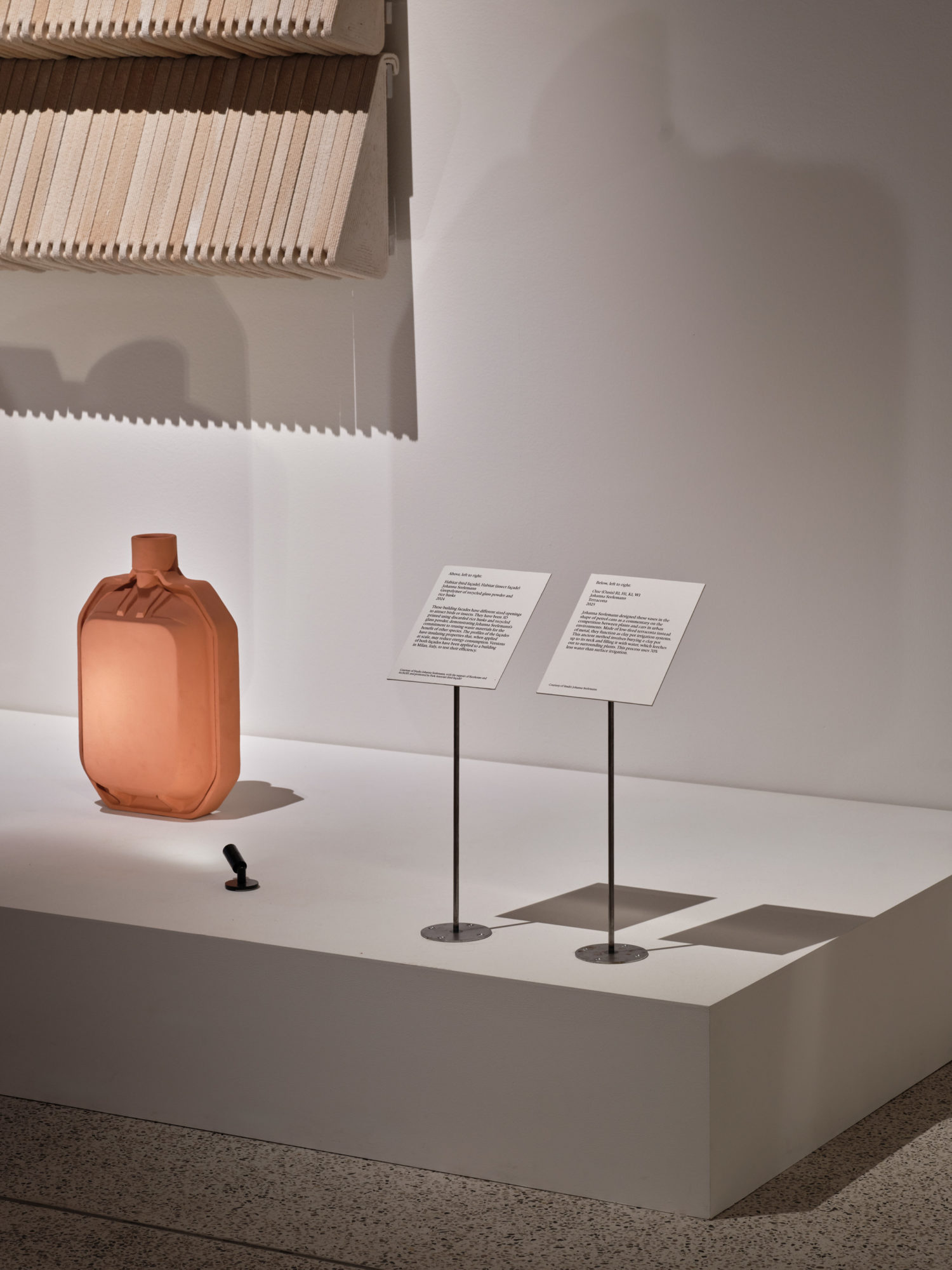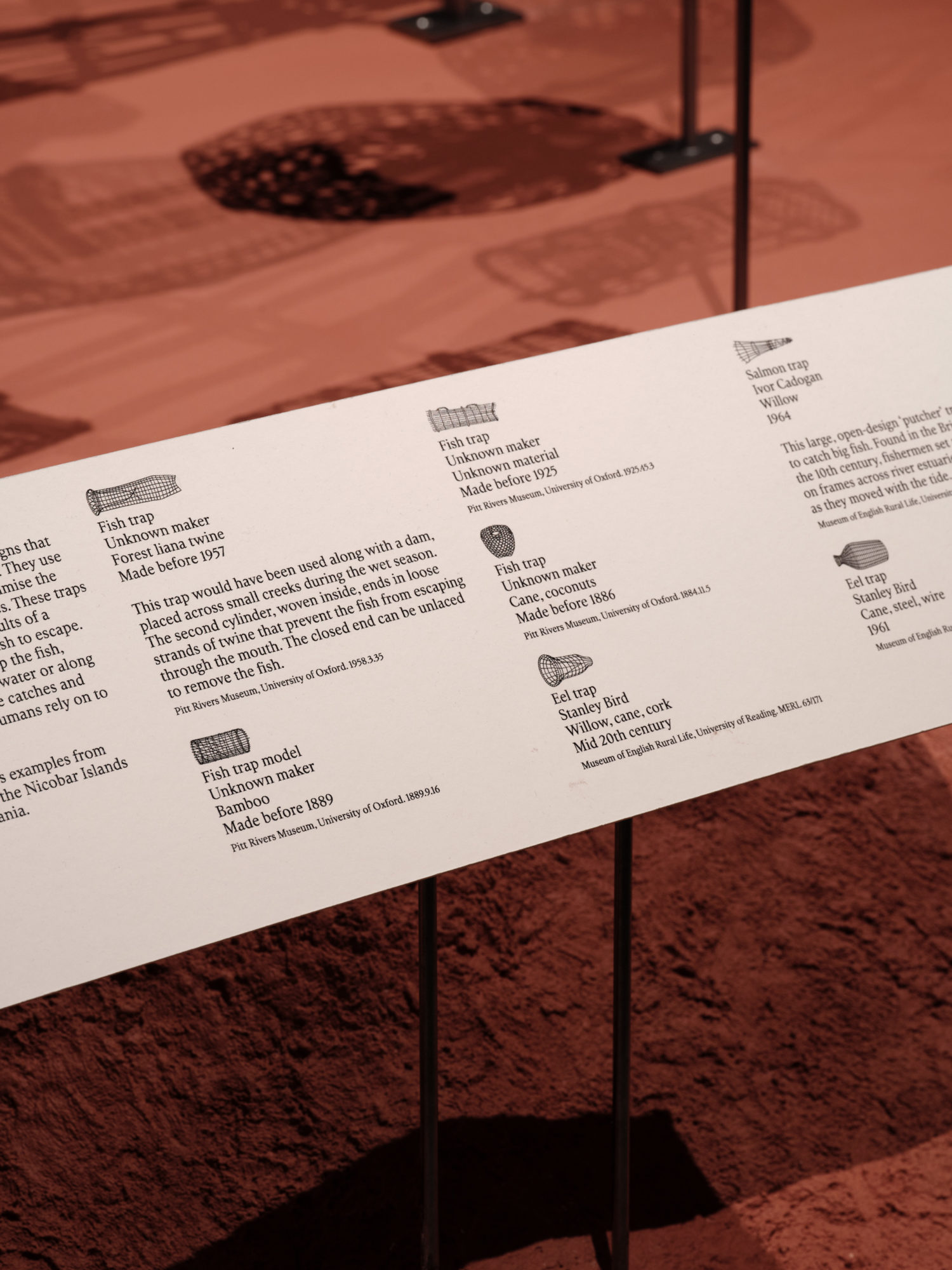 The title lettering was produced as a wandering line, using our hands as tools – fingers dunked in paint and ink and moved across the walls, sign-written directly onto the surface. We developed multiple weights governed by the real sizes used in the show: larger type drawn with the whole hand, smaller with two fingers. All graphics were printed on sustainably made paper, and the catalogue was bound in raw brown card to echo the terracotta build.